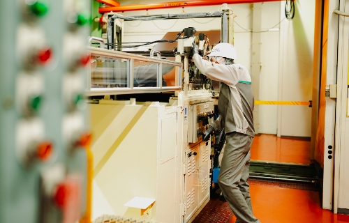 この機械のおかげで、缶づくりにぴったりの大きさの材料が準備できるんです。