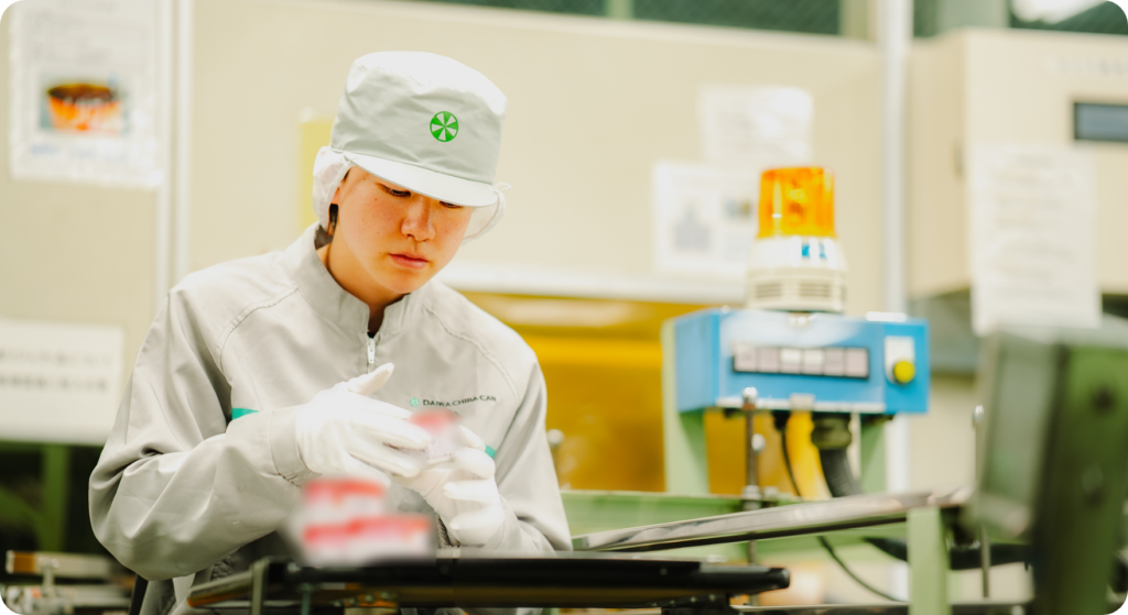 製胴課では缶のボディをつくっています。板をカットするスリッター、缶の形をつくるボディ、1 缶に分けるセパレーター、蓋とボディをくっつけるシーマ、そして私は最後の工程となる検缶・再検を担当しています。この工程は、缶が市場に出る前の最終チェック。出来上がった缶に不具合や傷がないかを、最新カメラによるチェックとともに目視で確認していきます。もし見落としてしまうと、クレームにつながってしまうため責任が大きい仕事なので高い集中力が求められます。でも、その分お店で自分たちがつくった缶が並んでいるところを見ると、とてもやりがいを感じます。