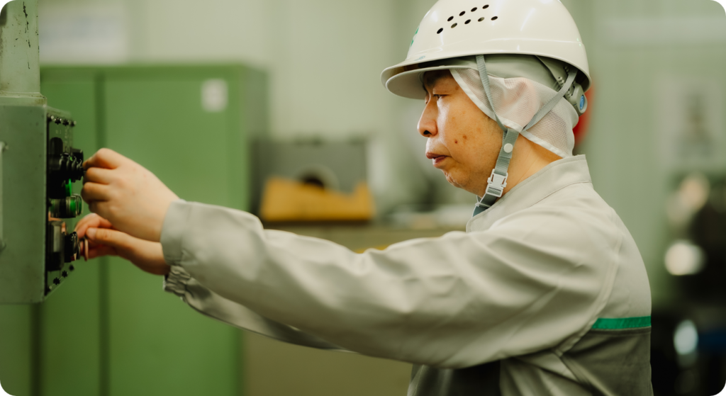 私は、工務課に所属しています。工務課では電気・空気など、工場にあるユーティリティ関係の設備の管理をしています。また、制御盤やセンサーなど、電気設備の故障対応も担当します。実際に製造をするポジションではないですが、そもそも電気がなければ機械を動かせないので、そういった意味でも工務課の仕事はまさに「工場全体の心臓部のような仕事」と言えるかもしれません。だからこそ設備に不具合があった際、補修作業を経て正常稼働を確認できたときは、ホッとするとともに大きなやりがいを感じます。